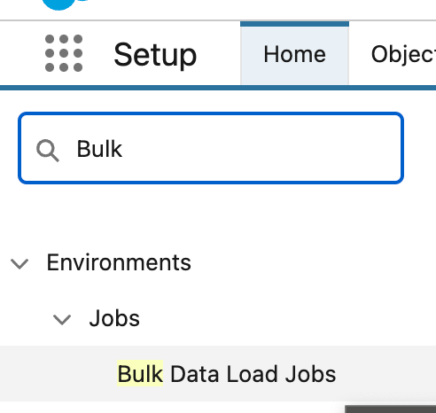 You can locate bulk load jobs in the Setup menu by searching for them. The bulk load job process consists of three main steps: opening a job, loading data into it, and closing it. In this section, you can identify any issues with the uploaded data or determine if Salesforce encountered errors while processing your records.