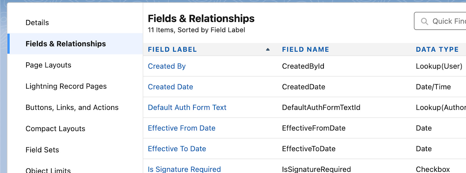 Let’s dive into Salesforce fields. There are a few ways to identify the fields you need, but for this article, I’ll walk you through one method. First, go to the Object Manager in Salesforce. Then, navigate to the object you’re working with and click on Fields and Relationships.